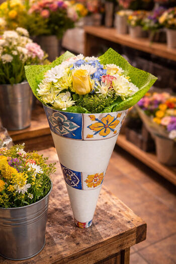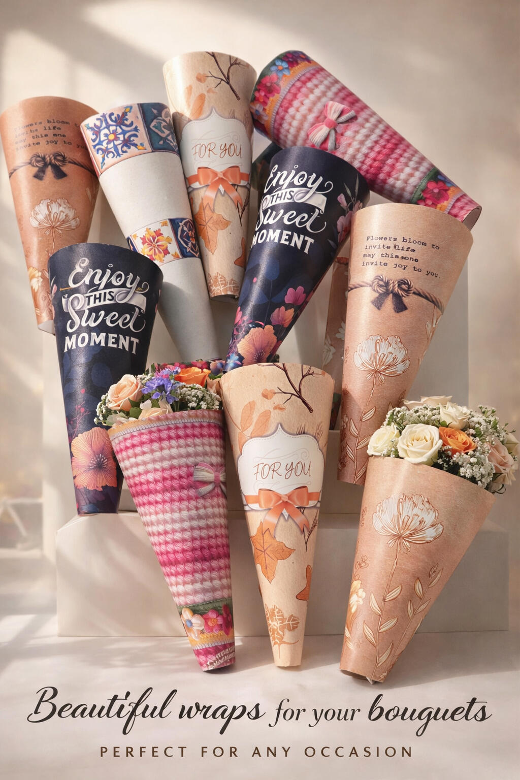 Yuda Wraps are designed for speed and simplicity. With double-sided adhesive already applied, the wrap is easily folded into a cone shape in seconds. In less than one minute, staff or customers can place the flowers inside and create a clean, secure, and gift-ready bouquet .